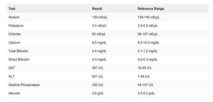 Investigations: Bloodwork on admission was notable for [Table 1].