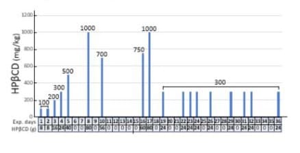 Figure 1: Regimen for iv administration of HPβCD. The days into the trial and the total weight of HPβCD are indicated on the horizontal axis with drug free days denoted are “0”. The doses of HPβCD are calculated at the body weight of 80 kg and noted in the vertical axis.