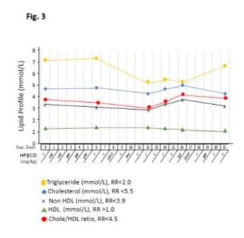 After 5 days washout, HPβCD was re-introduced and blood was collected prior to HPβCD administration on day 16. Cholesterol was reduced by 14% from 5.0 mmol/L on day 16 to 4.3 mmol/L on day 21, non-HDL was reduced by 15.7% from 3.8 mmol/L on day 16 to 3.2 mmol/L on day 21, and cholesterol/HDL radio was reduced by 6.9% from 4.2 on day D16 to 3.9 on day 21.