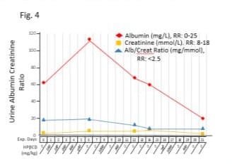 HPβCD usage significantly improves renal function by reducing albumin loss from urine from 61mg/L pre-treatment to 20mg/L (Reference Range 0-25) after treatment. The risk of cardiovascular mortality in low uACR could be reduced by nearly 1.5- fold, compared with high uACR [18].