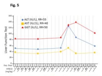 Figure 5: Effects of intravenous infusion of HPβCD on liver function tests. The horizontal axis represents the days of the experiment (Exp. Days) and the doses of HPβCD in milligrams per kilogram body weight. After iv administration of HPβCD, venous blood samples were periodically analysed for alanine transaminase (ALT), aspartate aminotransferase (AST) and gamma glutamyl transferase (GGT). RR indicates normal reference ranges. HPβCD at low doses did not change levels of liver enzymes although higher doses of different brands had different effects on liver enzymes. Details are elaborated in the text.