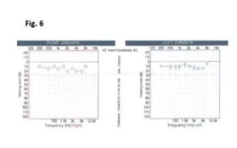 Figure 6: HPβCD had no adverse effect on hearing shown in audiometry on day 8 of HPβCD regimen. Right: Hearing (O represents air conduction, AC) was within normal limits at 250 Hz to 8 kHz. Left: Hearing was within normal limits at 250 Hz to 8 kHz (X represents AC; > represents bone conduction, BC).