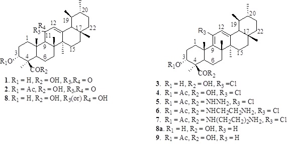 Compound 4 was treated with thionylchloride at reflux temperature to obtain its acid chloride. Without purification, the crude acid chloride was subjected to amidification separately with diamino compounds selected from hydrazine, 1,2-diaminoethane and piperazine in THF at ambient temperature and each of the corresponding crude reaction mixtures were subjected to column chromatography over silica gel using hexane/ethyl acetate mixture as eluents to yield the amide compounds 5, 6 and 7 respectively in 60-70% over all yield. The structures of the analogs were confirmed by using 1H, 13C NMR, mass and IR spectra. For comparison, 3-O-acetyl-9-ene-b-boswellic acid (9) was prepared by subjecting KBA to reduction using excess lithium aluminum hydride followed by purification and acetylation of the intermediate 9-ene-b-boswellic acid