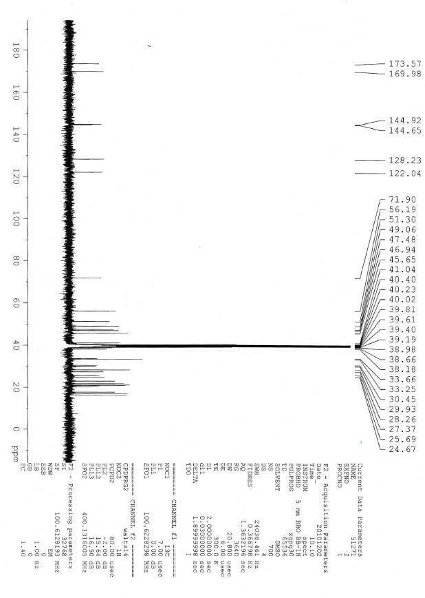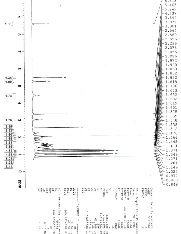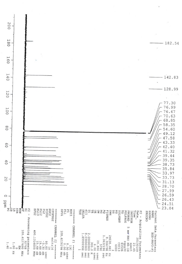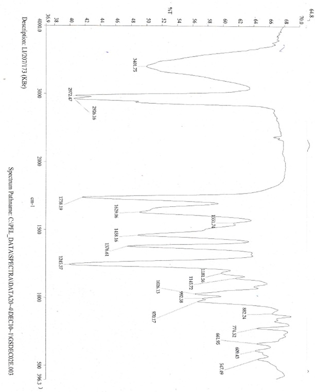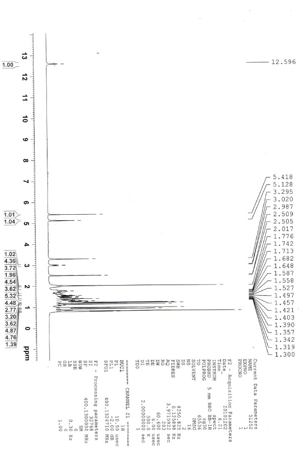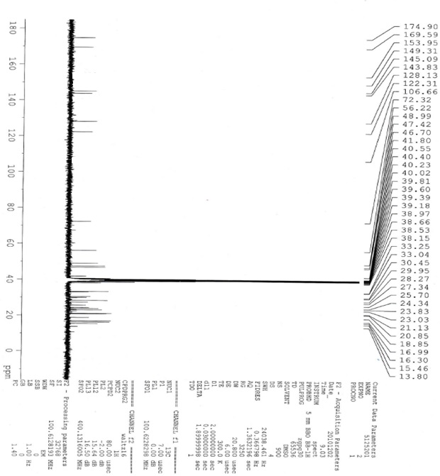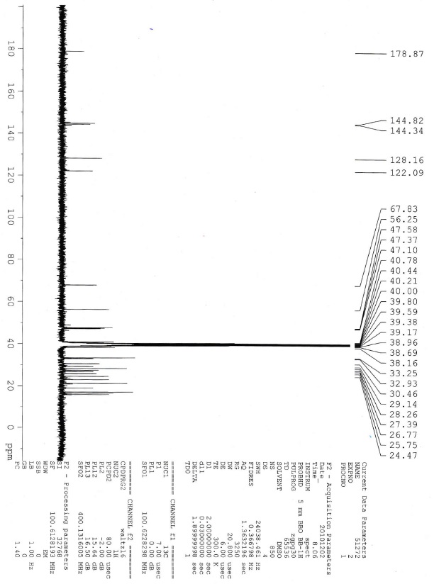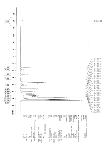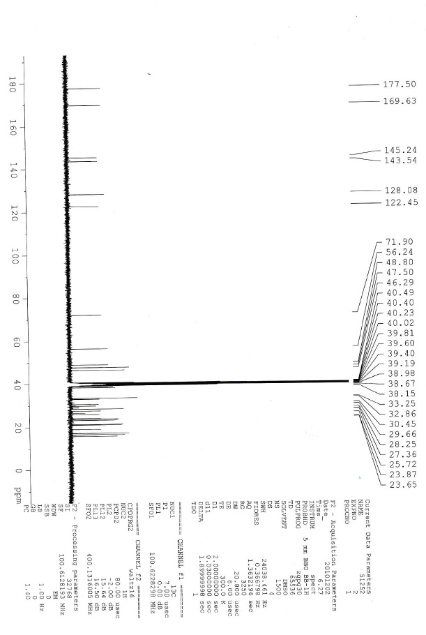 (3H, s), 1.19 (3H, s), 1.10 (3H, s), 0.97 (3H, s), 0.92 (3H, s), 0.87 (1H, m), 0.81 (3H, s), 0.80 (3H, d, J = 6.8 Hz); 13C NMR (d6DMSO, 100 MHz): δ 174.9, 169.6, 145.1, 143.8, 128.1, 122.3, 72.3, 56.2, 49.0, 47.4, 46.7, 41.8, 40.6, 40.4, 38.6, 38.5, 38.2, 33.3, 33.0, 30.5, 29.9, 28.3, 27.4, 25.7, 24.3, 23.8, 23.0, 22.3, 21.1, 20.9, 18.8, 16.9, 16.3, 15.5; IR (KBr, νmax): 3433.81, 2971.49, 2925.43, 2863.71, 1727.21, 1649.68, 1509.33, 1455.64, 1376.88, 1253.48, 1024.97, 992.20 cm-1; LC-MS: m/z 573.5 (M+H)+, positive ion mode.