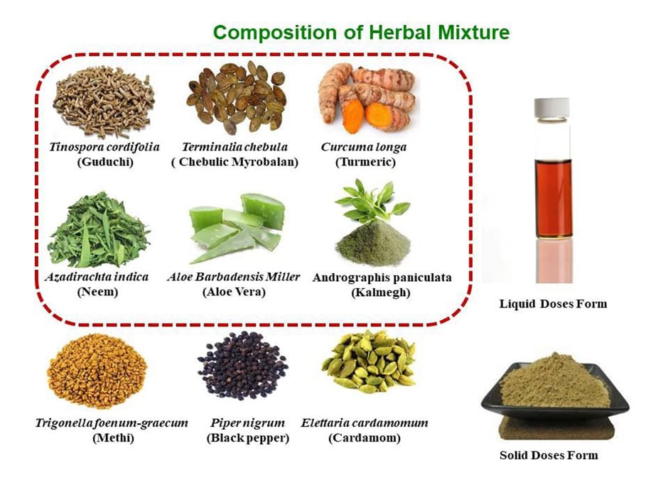 Figure 1: Composition of multi herbal formulation (ASKK16-LIV01)containing six medicinal herbs and three medicinal spices.