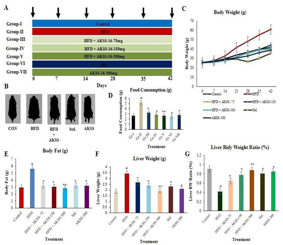 Figure 6: Ameliorative effect of AKSS-16-LIV01 on different morphology & Histology under HFD induced Obesity in mice.