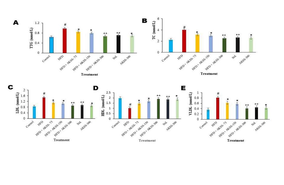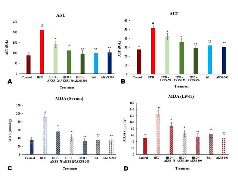 Obesity is closely associated with liver abnormalities, including liver fibrosis, steatohepatitis, fatty liver, non-alcoholic fatty liver disease (NAFLD) [30,31,36,37]. People all over the globe are really worried about that. To overcome this situation presently scientists and researchers are engaged in research to find out a permanent safe and symptomatic anti-obesity solution. Unfortunately, different indirect strategies like diet, exercise & yoga, behavioural adaptation modifications not only make a solution to prevent obesity but also showed several health complications. Therefore, world need a novel, effective, and safe anti-obesity interventions which not only prevent obesity but also minimise the related complications. High-fat diet (HFD) is a major cause of obesity which is closely linked to a variety of health issues, including coronary heart disease, high blood [32] pressure, stroke, liver diseases, diabetes and cancer [33,38]. Reactive Oxygen Species (ROS) are closely associated with obesity leads to numerous degenerative diseases such as atherosclerosis, ischemic heart disease and aging, etc. In the obese condition ROS generally suppressed the antioxidant enzymes activity which disrupt the antioxidant defence mechanism produce cellular imbalance and ultimately cell apoptosis [32,34,35,39-41]. So, oxidative stress is one of the causative factors that link hypercholesterolemia with the pathogenesis of linked diseases [36,37,42,43]. In the present study, administration of high fat diet (HFD) showed an increase in TC, TG, LDL-C and VLDL-C level and decrease HDL-C level in mice. Furthermore, administration of AKSS-16-LIV-01 at a dose of 300mg /kg/day showed a significant (p<0.001) reduction in TC, TG, LDL-C and VLDL-C levels and increase in HDL-C level in HFD treated mice. Deviations from cholesterol transport increases LDL levels or decreases HDL cholesterol flux, which may result in accumulation of cholesterol in extra hepatic tissues. Therefore, from the present findings it is presumed that the prevention of hyperlipidaemia may be due to the inhibition of biosynthesis of cholesterol and triglycerides by the developed novel formulation.