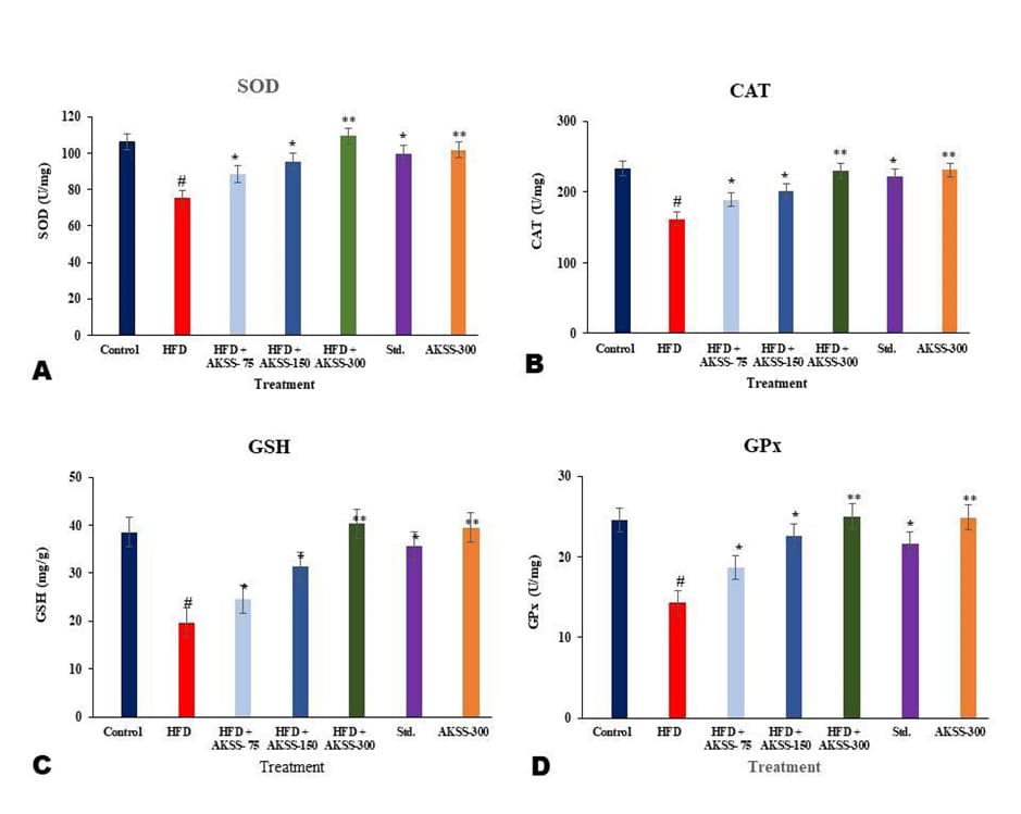 Figure 5: Free radical scavenging activity (SOD, CAT, and GSH & GPx). Values are expressed as Mean ± SD (n = 6 per group). *Significantly different from control #(p<0.001) and significantly different from HFD *(p<0.05) ** (p<0.001) using analysis of variance (ANOVA) followed by Dunnettʼs Multiple Comparison Test. SOD: Super oxide dismutase, CAT: Catalase, GSH: Glutathione, GPx: Glutathione Peroxidase.