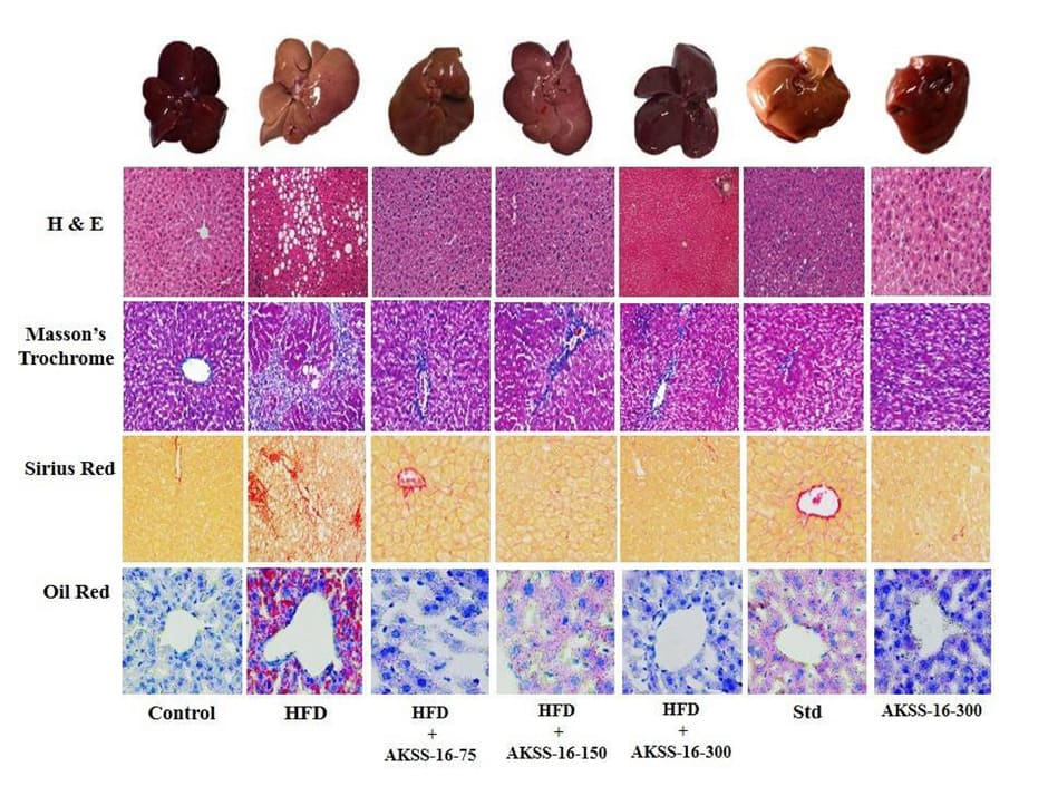 The liver of the High fat diet group was significantly enlarged and the colour of liver becomes pale. The physical appearance, i.e., colour, size and smoothness of the liver of AKSS-16-LIV-01 supplemented with HFD group remain unaltered comparing those of the normal control group. Figure 6, shows the microscopic appearance of the liver tissues. Steatosis (fatty change) clearly existed in the liver tissue of the HFD group as shown in Fig. 6. Lipid accumulation in the hepatocytes as vacuoles, and large droplets were observed in most hepatocytes, in particular in the periportal regions. In contrast administration of AKSS-16-LIV-01, protected the liver tissue from high fat diet, little or no fatty droplets were observed in the AKSS-16-LIV-01 treated group, and decreased the number of vacuoles appeared (Figure 6).