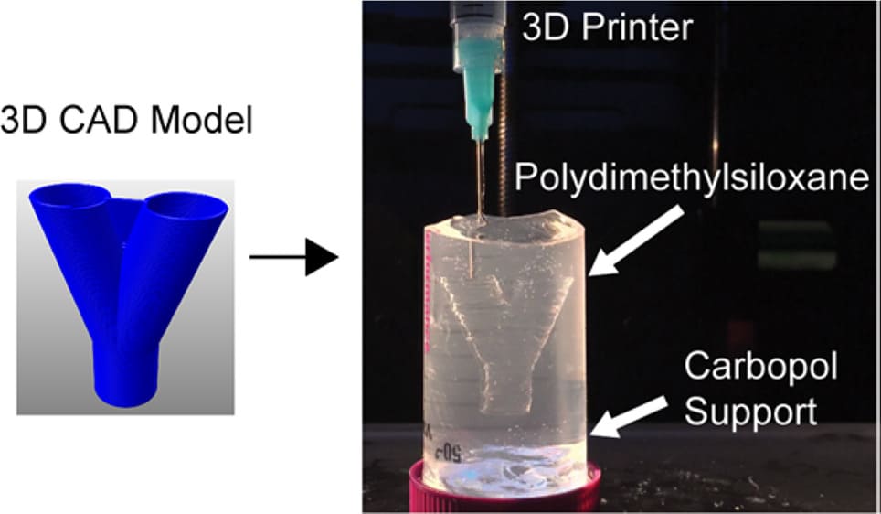 Figure 1: Experimental testbed of FRE using Carbapol (a) 3D Printing of hydrophobic PDMS prepolymer resins within a hydrophilic Carbopol gel support. Carbopol maintains the dimensional stability of the PDMS prepolymer within the support for up to 72 hours. (adopted from [4])