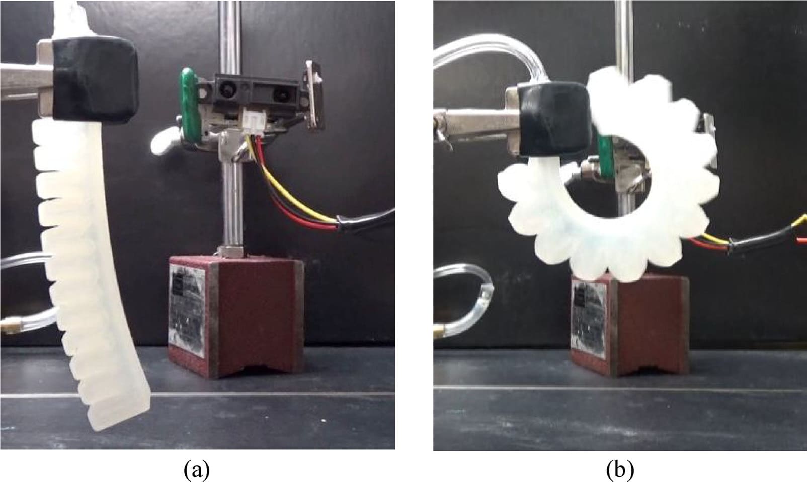 Figure 9: Finger pneumatic actuator in a (a): Non-articulated; and (b): Fully articulated configurations. (Adopted from [2]).
