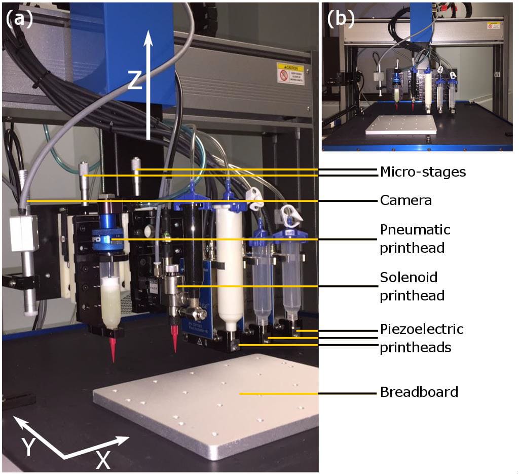 Three controlling units sits on a 3-axis motion stage to actuate the piezoelectric stacks by sending out the voltage signals, and one controller coordinates the air-pressure in the extrusion-based printheads. The Slic3r software creates the toolpaths for the multiple nozzles. The UV-curable silicone used contains the photoinitiator, 2-Hydroxy-2-methyl propiophenone and has a dual UV/moisture curing mechanism. The polymerization process completes within a few seconds after the UV exposure with 365 nm wavelength. The full mechanical properties are achieved after exposure to the environmental moisture for 7 days.
