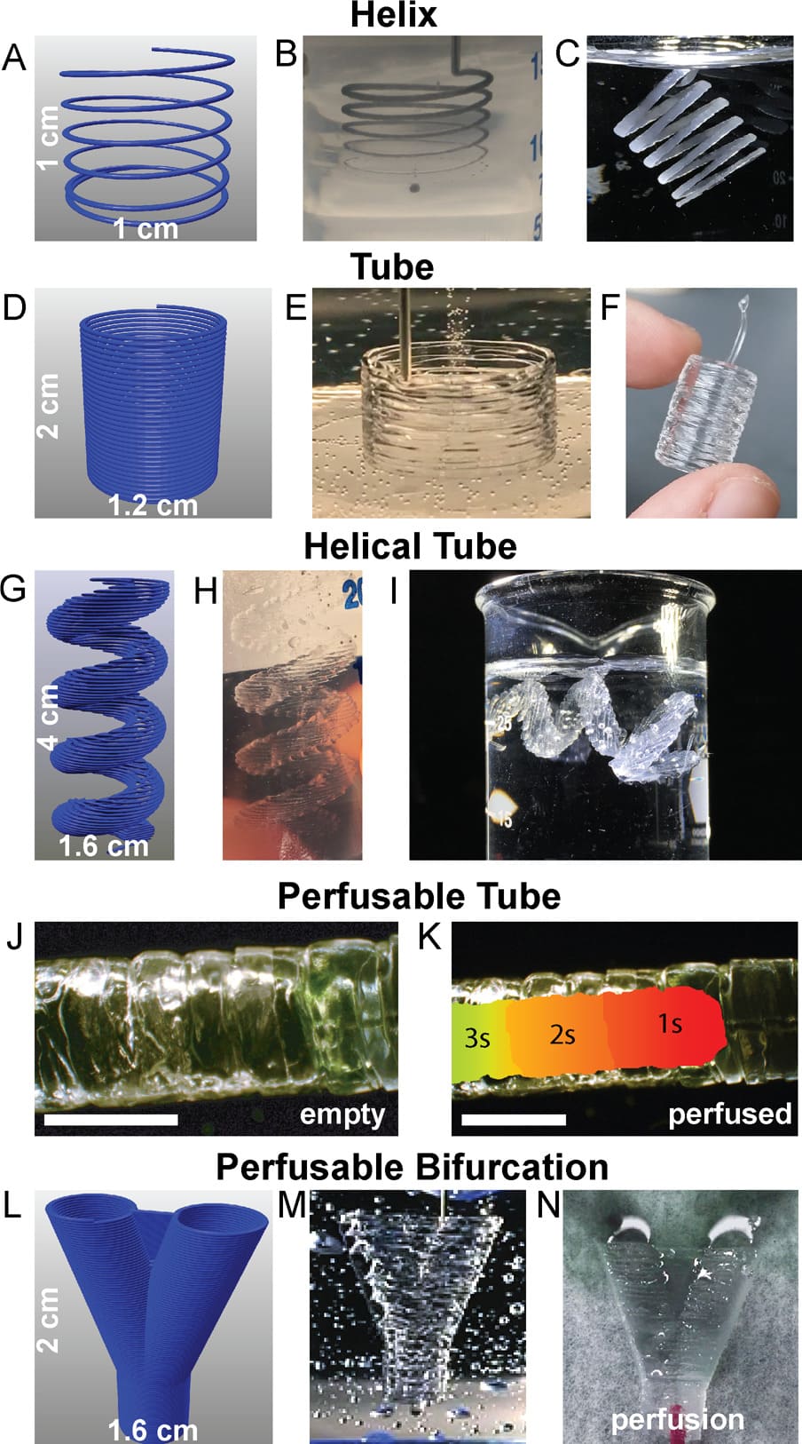 Figure 2: (adopted from [4]) Representative FRE printed PDMS structures using the Carbopol support. (adopted from [3]); (A): The Carbopol gel is capable of supporting freeform extrusion such as this helical path rendered in G-code; (B): The helical extrusion appears identical to the G-code when embedded in the Carbopol (dyed black for visualization); (C): After curing and release, the PDMS helix print retains its geometry when floating in water; (D): G-code for a cylindrical tube (E): The layers of PDMS filaments fuse into a monolithic surface; (F): After curing and release, the printed tube remains fused between layers and is stiff enough to maintain its geometry while being handled; (G): The G-code for more complex helical tube; (H): the helical tubes are supported within the Carbopol; (I): Release of the helical tube from the Carbopol gel shows the maintenance of geometrical features, supported in water because it cannot support its own weight, even when cured; (J): A PDMS tube to demonstrate the manifold nature of the print’s outer surfaces (scale bar is 4 mm); (K): A time-lapse heat map of dye perfused through the tube (scale bar is 4 mm.); (L): G-code of a bifurcation withwebbed fork for stability; (M): The FRE printed PDMS bifurcation embedded in the Carbapol; (N): Perfusion of dye through the bifurcation, splitting fluid flow.