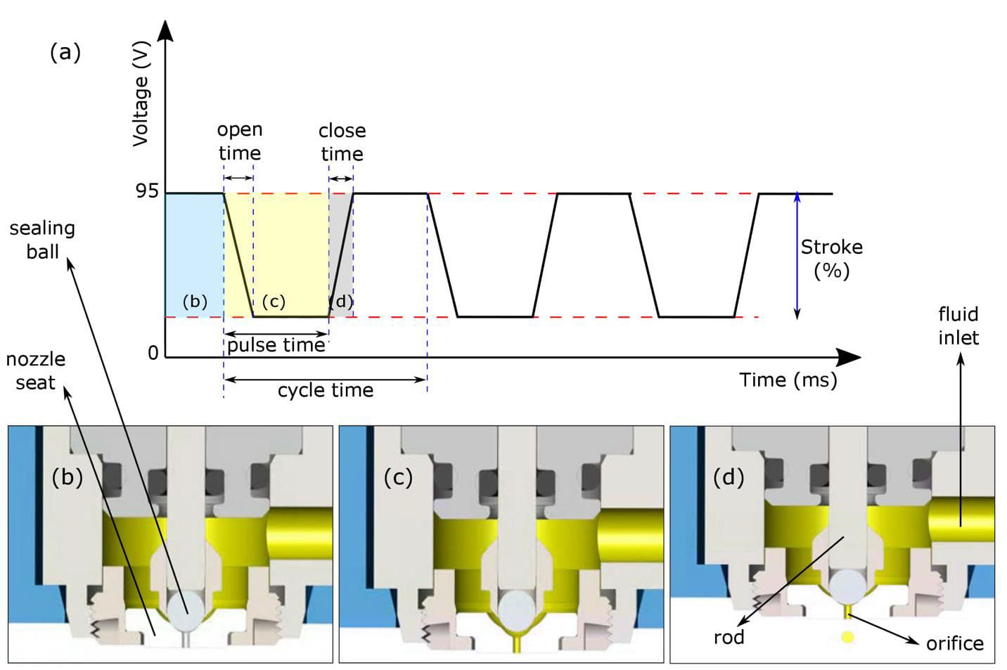 Figure 4: ( adopted from [3]) The working principle of the piezoelectric-based material jetting; (a): The plot shows the voltage signal sent to the piezoelectric stacks for three complete cycles, open time indicates how fast the valve is opened, close time indicates how fast the valve is closed, pulse time is the total time the valve is open, and the cycle time is the total duration of one open/close cycle; (b): Corresponds to the blue region of the plot showing the time duration that the valve is closed; (c): Corresponds to the yellow region of the plot when the orifice is open and filled with the material; (d): Corresponds to the grey region of the plot showing the closing ramp.