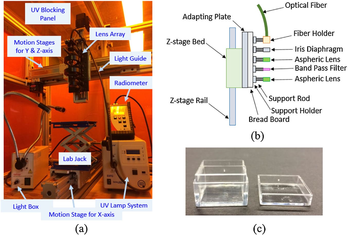 Figure 5: Experimental testbed of combined SLA-LOPP system: (a): The overall setup, (b): Schematic diagram of the lens array, and (c) acrylic boxes as a silicone resin container. (adopted from [1]).