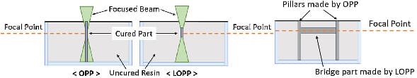 Figure 6: Schematic diagram of one-photon polymerization (OPP) and low one-photon polymerization (LOPP) showing printing of H-shape structure for proof of LOPP concept. (a): Front view; (b): Side view. (Adopted from [1])
