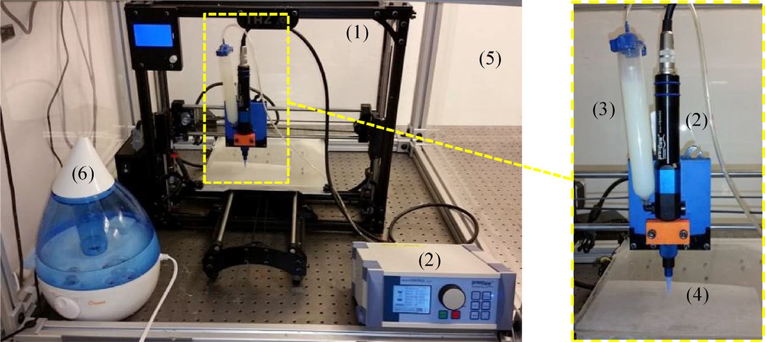 Figure 7: Experimental setup for moisture-cured extrusion-based silicone AM: legends: (1): Motion control platform; (2): Progressive cavity pump and controller; (3): Pressurized syringe barrel; (4): Tapered nozzle; (5): Enclosed build chamber; and (6): Humidifier. (Adopted from [2])
