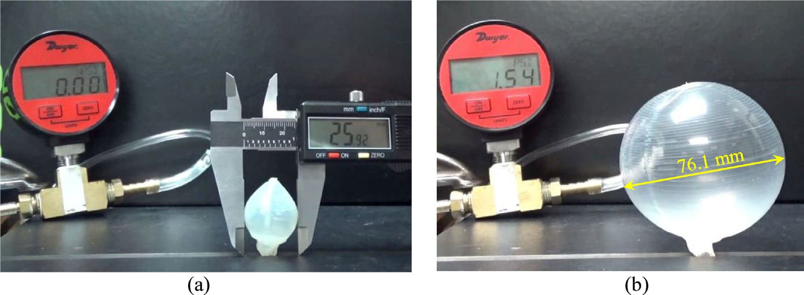Figure 8: Burst pressure test of sphere-like balloon: (a): The 25.9 mm initial diameter measured with a caliper; and (b): The inflated close-to-rupture balloon with the diameter measured using the pixel-distance correlation of the image. (Adopted from [2])