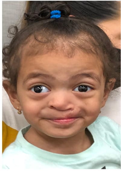 The patient was delivered vaginally at 40 weeks gestation, and birth was complicated by maternal COVID-19 infection. She was admitted to the NICU for further management of the cleft lip and palate which had been observed on fetal anatomy scan. At birth the infant was observed to have left postaxial foot polydactyly. At birth, a heart murmur was appreciated, and the patient was found to have a small ASD. Karyotype and microarray showed normal results. The patient remained in the NICU for 4 days for feeding support.