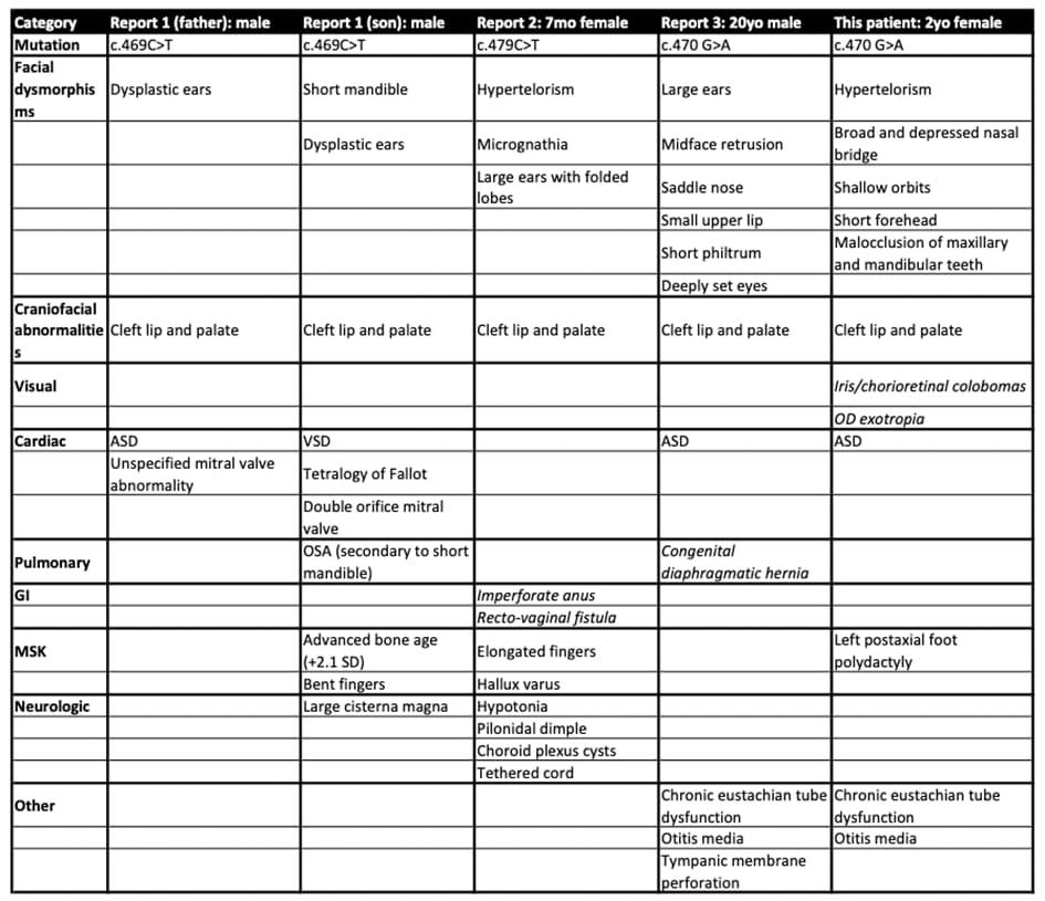 The second case described a seven-month-old female born with hypotonia, cleft lip and palate, imperforate anus with rectovaginal fistula, pilonidal dimple and dysmorphic features including hypertelorism, micrognathia, large prominent ears with a folded earlobe, elongated fingers, and hallux varus of the right foot. Further evaluation showed choroid plexus cysts and a tethered cord. Development was age appropriate. The mutation was identified as a de novo missense variant (c.479C>T) in a highly conserved residue [2].