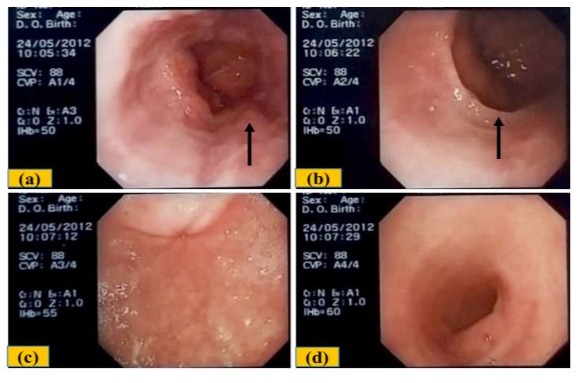 Figure 1. (a) Inflammation and erosions at gastroesophageal junction and a small Barrett’s (Arrow). (b) Incomplete Schatzki’s ring (Arrow). (c) Moderate diffuse erythema with mild erosions in the antrum. (d) Pylorus and initial part of duodenum appear normal.