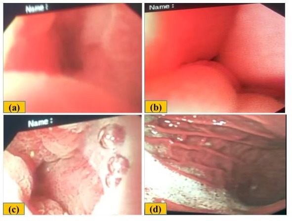 Figure 2: (a & b) Normal gastroesophageal junction, no erosions, Barrett, or Schatzki’s ring (c) Erosions in antrum, possibly age related (d) Normal pylorus.