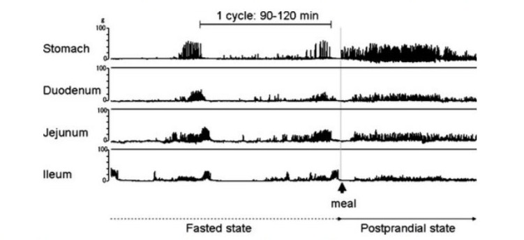 Figure 3: During fasting, cyclic contractions & relaxations at regular intervals (MMCs), propel food onwards. In post-prandial state; irregular tonic contractions, prevent propulsion of food [13].