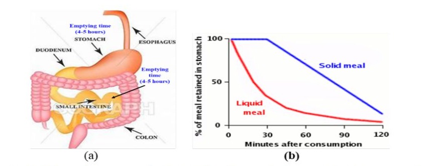 Figure 4: (a) Suitable interval between two meals is about 8-10 hours, when stomach and upper part of intestines are empty [14]. (b) Liquid meal is fast to leave stomach and solid food takes longer [15].