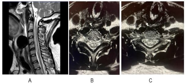 Figure 1A: MRI Cervical spine - Sagittal T2 sequence showing hyperintensity from C2 to C6 in the anterior portion of the spinal cord (ACA territory). Figure-1B and 1C are axial sections showing lesion in the grey matter region (Owl’s eye appearance).