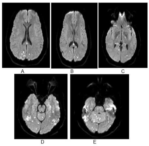 Figure 2A-E: MRI Brain – Diffusion sequence showing bilateral punctate restricted diffusion; A and B - parietal and occipital infarcts, B-E - Occipital infarcts, D and E – bilateral cerebellar infarcts.