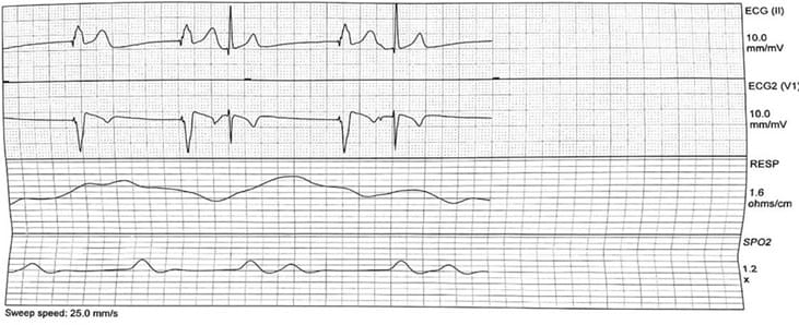 Figure 6: EKG rhythm strip-showing bradycardia during patient neck movement.