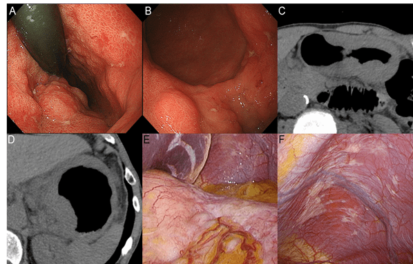 Figure 3: Clinical findings 45 months after the initial diagnosis when the patient requested surgical resection, complaining of anorexia and weight loss. Endoscopically, lesion 1 involved lesion 2, forming giant folds (A,B). Abdominal CT showed circumferential wall thickening from the esophagus to the lower part of the gastric body and enlarged lesser curvature lymph nodes (C, D). Staging laparoscopy revealed that the tumor was extensively exposed on the serosa, mainly located in the cardia, and the lesser omentum was thickened by peritoneal dissemination (E). Disseminated nodules were also found on the left diaphragmatic surface (F).