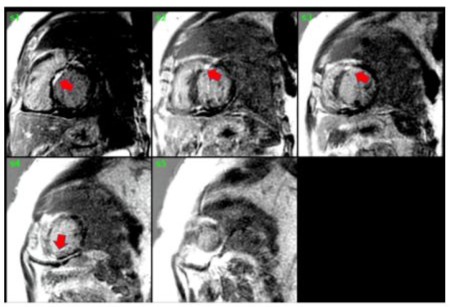 Figure 2: Delayed myocardial enhancement imaging showed the presence of 25-50% sub-endomyocardial patchy enhancement in the anterior, anteroseptal, and apex sarcoidosis.