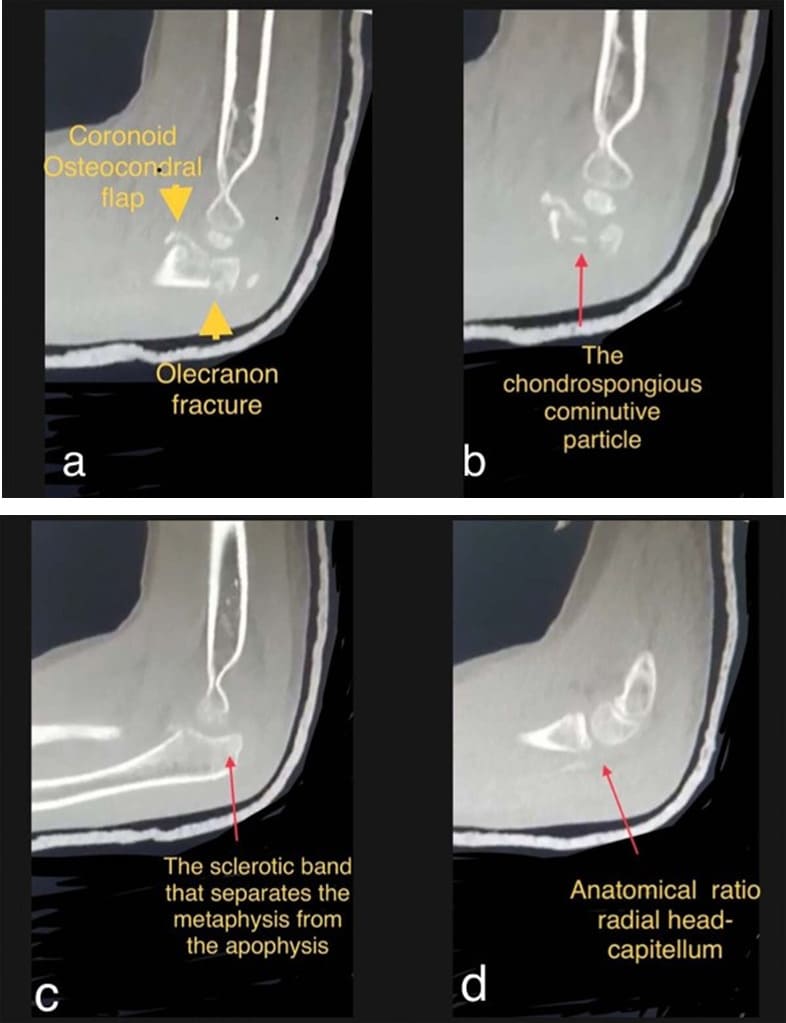 Figure 3: CT images confirm the olecranon fracture and identify a coronoid fracture. a) The characteristic appearance of the paediatric coronoid fracture; the chondral flap involves the entire distal trochlear compartment. b) The comminute particle at the junction of the two fractures. c) The sclerotic area of least resistance; the olecranon fracture crosses this area. d) Radial head dislocation was reduced.