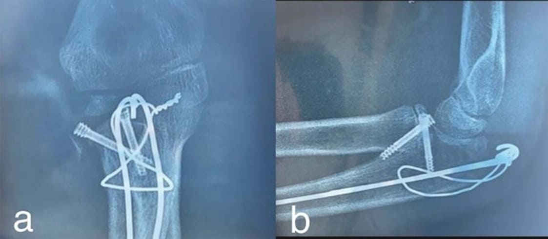 Figure 4: Anatomical reduction of fractures and fixation of the coronoid fracture with two Herbert screws and the metaphysical olecranon fracture with a figure-of-eight wire