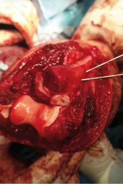 Metaphysical olecranon fractures with a trajectory in the sclerotic area induce bone and cartilage lacerations (Figure 9); bone lacerations form small particles of variable size. Comminute particles also generate grade III coronoid fractures. These particles are smaller in size and are disseminated when reduction and fixation are attempted. Chondral lacerations are less common and have a lamellicorn appearance. In this case, the intervention must have a distinct operative time for their detection and evacuation. In the studied patient, we extracted four bone particles and a chondral lamella. When they remain in the joints, they produce heterotopic ossifications that cause impingement with limitation of elbow mobility.