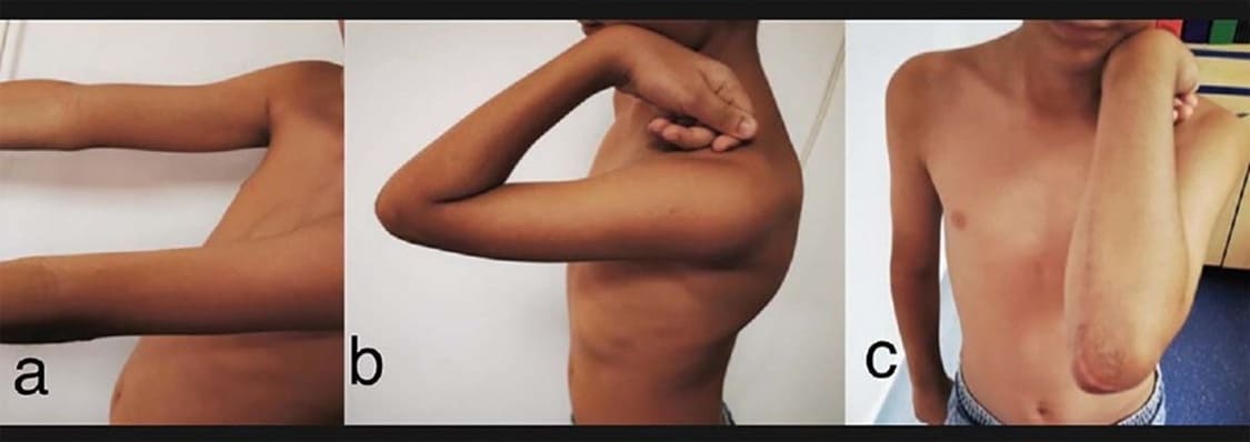 Figure 6: At the 60-day postoperative control, elbow flexion and extension were fully recovered. a) extension; b) and c) flexion