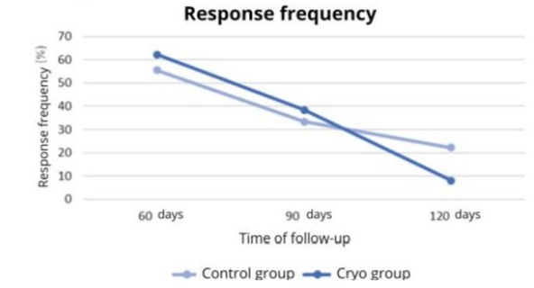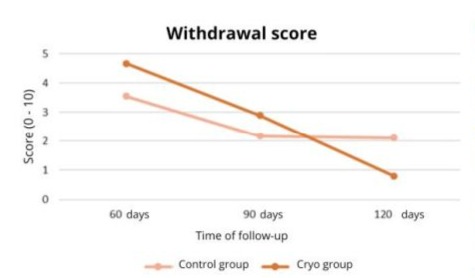 The analysis of generalized estimating equations (GEE) models indicates a significant effect of the type of treatment on WS at 120 days (p=0.038). Therefore, there was no statistically significant difference between the Control Group and the Cryotherapy Group in relation to the Response Frequency and Response Score at 60 and 90 days post-treatment. There was a statistically significant difference between the Control Group and the Cryotherapy Group in relation to the Response Frequency and Response Score at 120 days post-treatment, as the Cryotherapy Group showed a lower Response Frequency and a lower Withdrawal Score when compared to the Control Group.