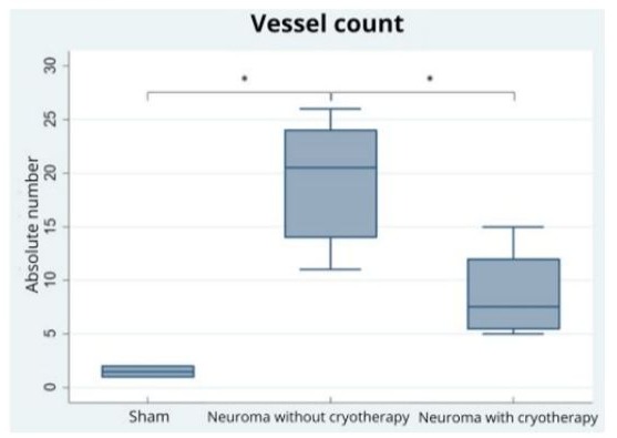 Therefore, the vessel count in the Control Group is statistically higher than in the Sham Group and the Cryotherapy Group.
