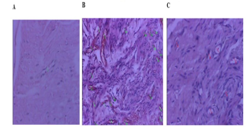Figure 6: Histological evaluation of the number of vessels, scanned at x200 magnification, using the hot spot principle. Slide from the Sham Group, with only 1 vessel (A). Slide from the Control Group, with an increase in the number of vessels (B). Cryotherapy Group (C).