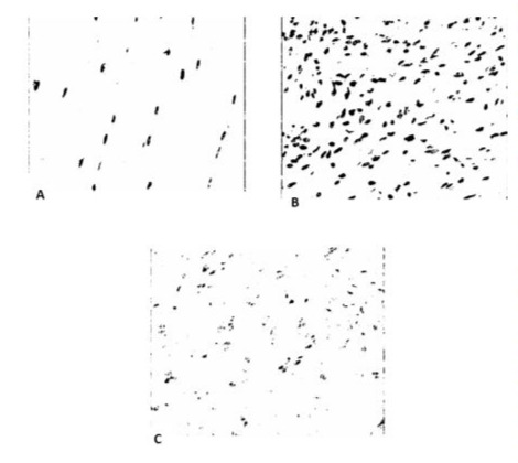 Figure 8: Digitized images at x200 magnification, showing the reaction of Schwann cells with the SOX10 protein antigen (dark area). Slide from the Sham Group (A). Slide from the Control Group, with an increase in the number of cells (B). Cryotherapy Group (C).
