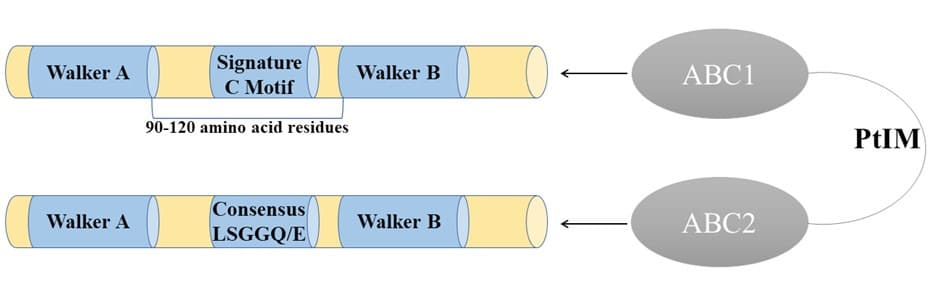 Schematic showing two nucleotide-binding domains ABC1 and ABC2 of ABC-ATPase (marked in grey) along with Walker A and B motifs (in blue), the motifs A and B are separated by 90-120 amino acid residues. The signature C motif is positioned upstream of the Walker B motif. The domains are connected by a flexible α-helical hinge region P-site tRNA interaction motif (PtIM).
