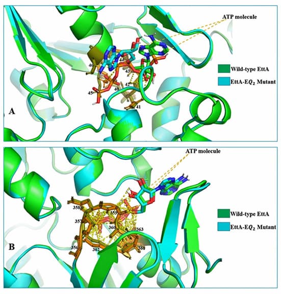 (A) ATP-bound wild-type EttA (green) and ATP-bound EttAEQ2 mutant (cyan) at ATP-binding site 1 (GLNGAGKS at position 39-46). (B) ATP-bound wild-type EttA (green) and ATP-bound EttA-EQ2 mutant (cyan) at ATP-binding site 2 (GPNGAGKS at position 356-363).