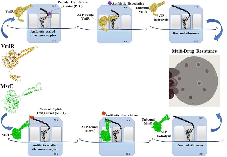ATP: adenosine triphosphate; ABC: ATP-binding cassette; ATPases: ATP hydrolyzing enzymes; TMDs: trans-membrane domains; EttA: energy-dependent translational throttle A; ESKAPE: Enterococcus faecium, Staphylococcus aureus, Klebsiella pneumoniae, Acinetobacter baumannii, Pseudomonas aeruginosa, and Enterobacter spp.; NBD: nucleotide-binding domain; PTC: peptidyl transferase center; GCN: General control non-repressible; ARE: antibiotic resistance; E-site: ribosome exit site; NPET: nascent polypeptide exit tunnel; P-site: ribosome peptidyl-tRNA-binding site; PtIM: P-site tRNA interaction motif; CTD: C-terminal; RbbA: ribosome-bound ATPase; PRE: pretranslocation; A-site: aminoacyl-site; MS: macro-states; MD: molecular dynamics; methionyl-tRNA; ORF: open reading frame; hABCF: human ABCF; DEGs: differentially expressed genes; BGC: biosynthetic gene cluster; RPP: ribosome protection proteins; ARD: ARE domain; PLSA: pleuromutilin, lincosamide, and streptogramin A; LPS: lipopolysaccharide; AMP: antimicrobial peptides.