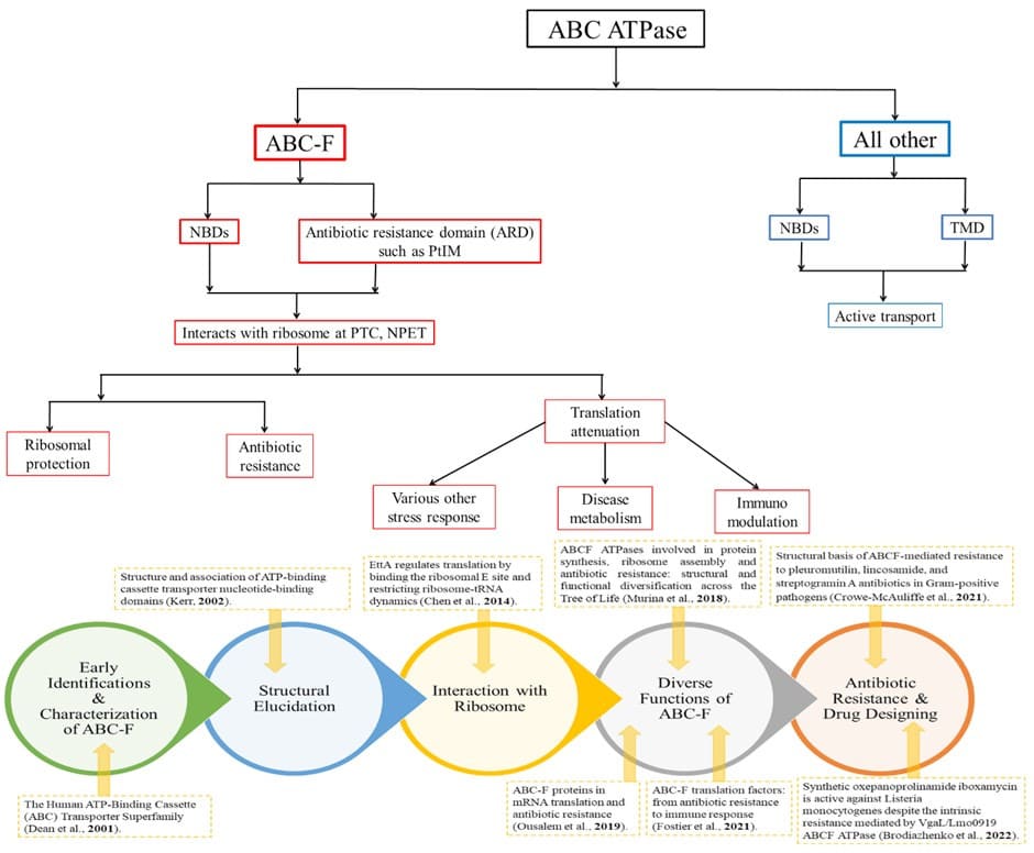 (Upper panel) Flow chart of structural and functional aspects of adenosine triphosphate (ATP)-binding cassette (ABC) ATPase. (Lower panel) Major landmarks in the field of ABC-F ATPase.