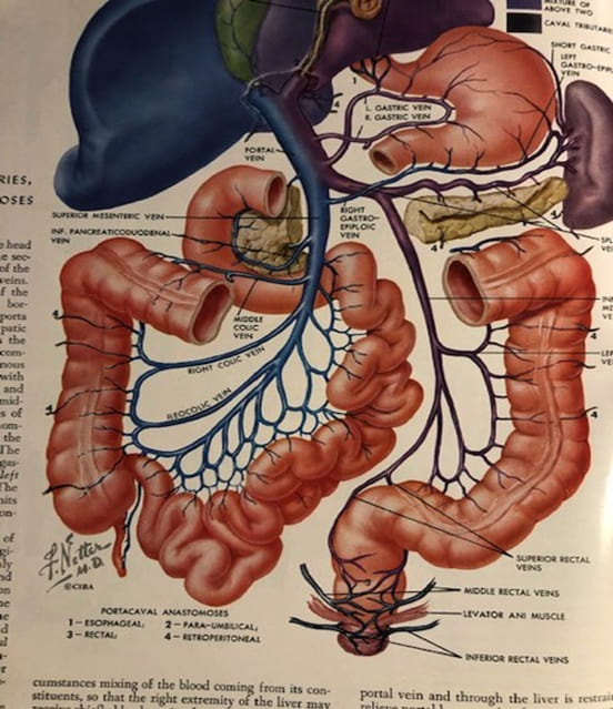 Figure 2 shows the venous drainage of blood from the intestines. This detailed illustration also reveals the venous anastomotic network of the intestines. In the mesentery, morphological evidence is seen of serial and parallel structures, which gradually merge where no actual separation can be seen. Additionally, evolution results in morphological exaptation, a well- established biological phenomenon that is a product of intentionally guided variation [38]. Notably, a change in structure must be accompanied by a change in function; the veins show a unity of form and function. When the largest surface along the intestine is drained, parallelism prevails through multiple collaterals. In terms