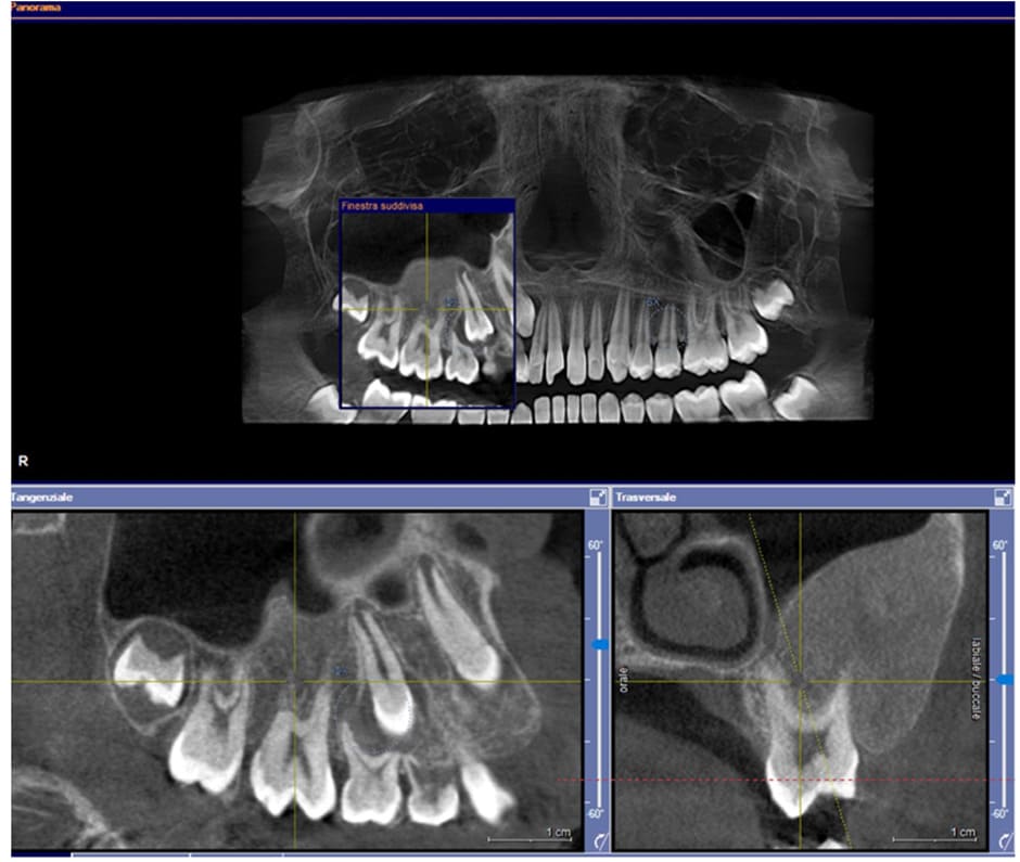 Figure 6-7: pre-operative CBCT scan, the upper transverse section shows the affected mandibular area. In the lower sagittal sections it’s also visible the affected area with the presence of an impacted tooth and the bifurcation of the inferior alveolar nerve.