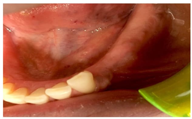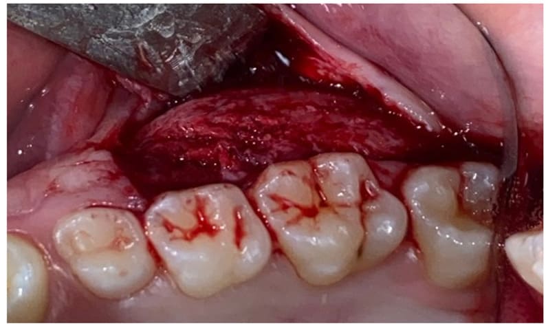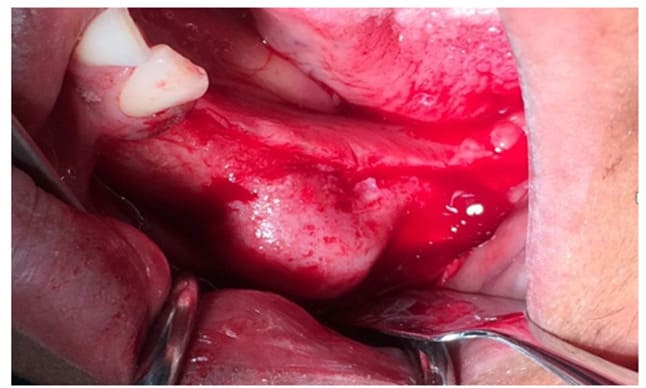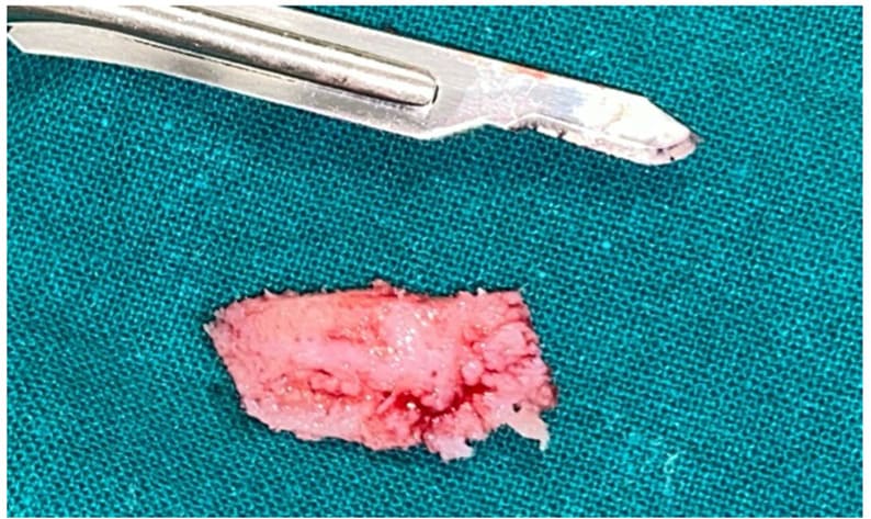 In Case 1, under local anesthesia (2% Mepivacaine Hydrochloride with 1:100000 adrenaline), a mucoperiosteal flap was raised (Fig. 3), fully exposing the fibro-osseous tissue. An incisional biopsy was then performed (Fig. 4), obtaining a sample measuring 2 cm x 0.6 cm x 0.3 cm (Fig. 5).