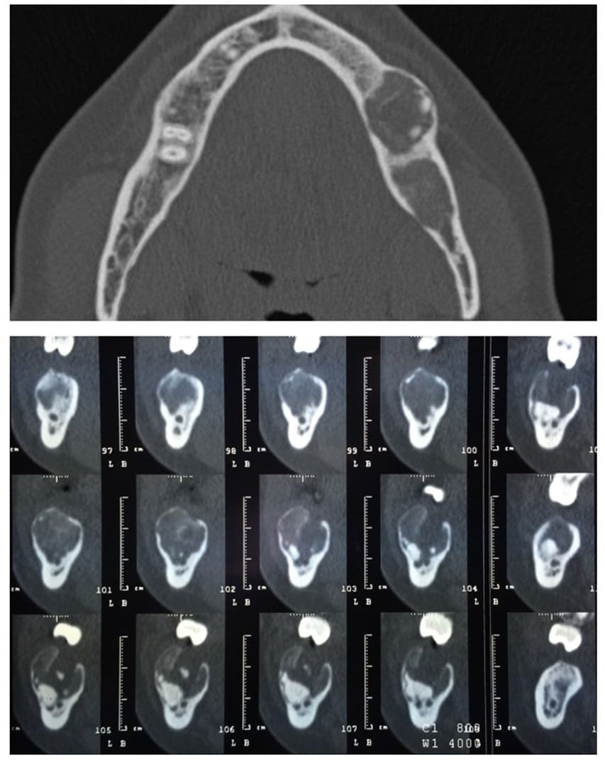 Case 2: a 52-year-old Brazilian female patient was referred to the Odontostomatology Department of Galliera Hospital in Genoa, Italy, with an asymptomatic deformation of the edentulous left posterior mandible (Fig. 8). The OPT revealed an irregular radiopacity in a poorly defined radiolucent area with a cystic appearance. Subsequent CBCT revealed a 20x15x15 mm osteolytic round lesion adjacent to the inferior alveolar canal, exhibiting bifurcation in correspondence with the radiodense mass, indicative of an impacted tooth. Posterior to this radiopacity, a smaller lesion was observed, involving the mandibular ramus (Fig. 6-7).