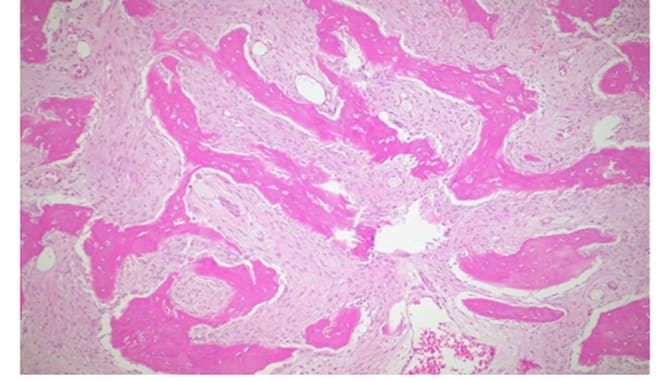 In both cases, histopathological examination revealed osseous tissue characterized by immature bony trabeculae with irregular shapes and sizes, thin and disconnected from each other, surrounded by a fibroblastic stroma, without evidence of osteoblastic activity. At the periphery of the biopsy specimen, the fibro-osseous tissue merged with bone without encapsulation or a demarcation line. This histological pattern is consistent with a diagnosis of fibrous dysplasia. Genetic testing for GNAS gene mutations was not performed because this investigation has a low statistical sensitivity and is useful for uncertain histopathological diagnoses.